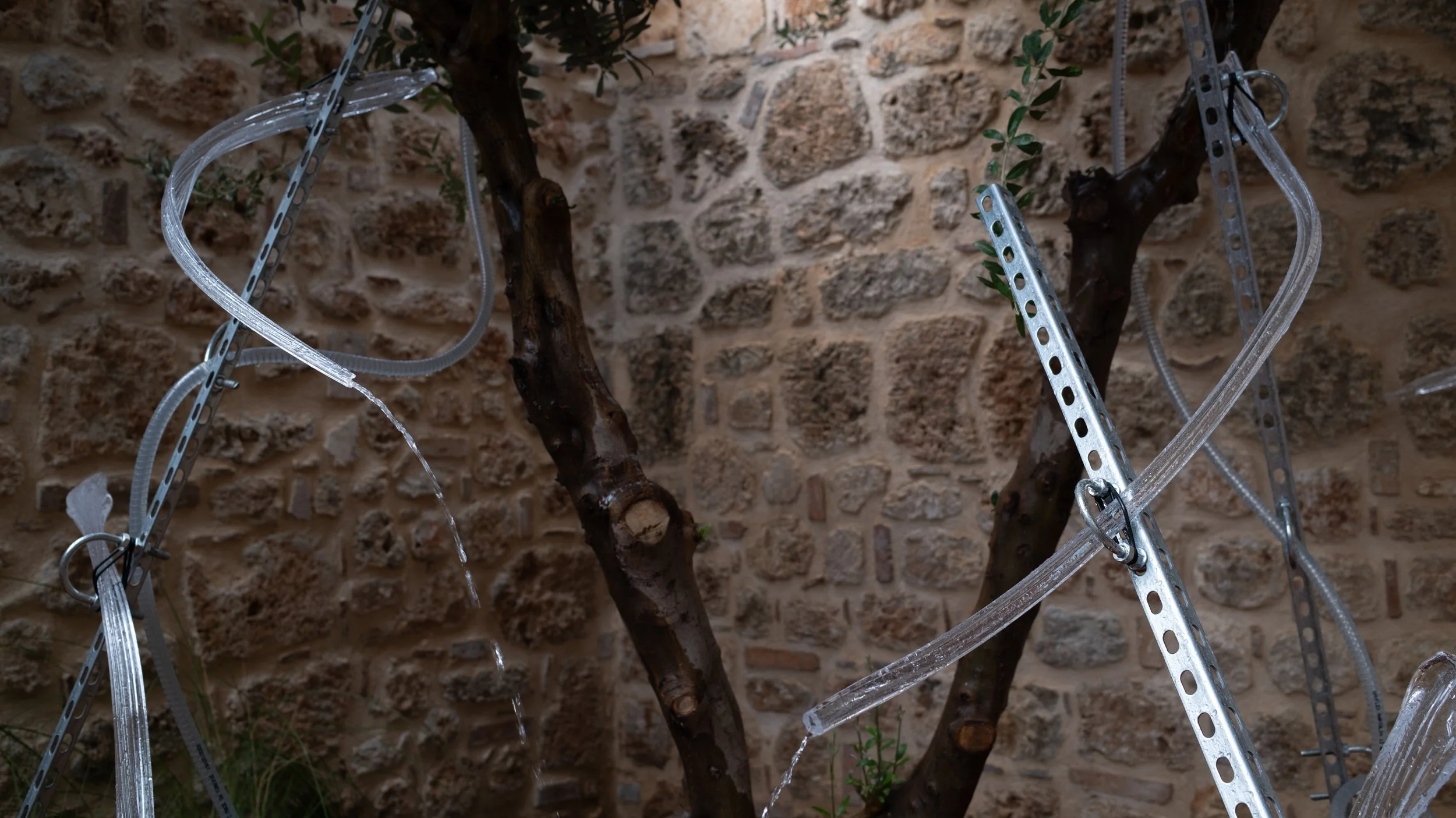 A fountain unfolding through the encounter of two artists. The piece builds upon an ongoing fieldwork during which the artists traveled across the Turkish Mediterranean shoreline collecting seawater samples. Two samples were taken from two locations that border the city of Antalya. These samples are now the source of the fountain and are connected through paths that connect the locations on the Mediterranean shoreline.